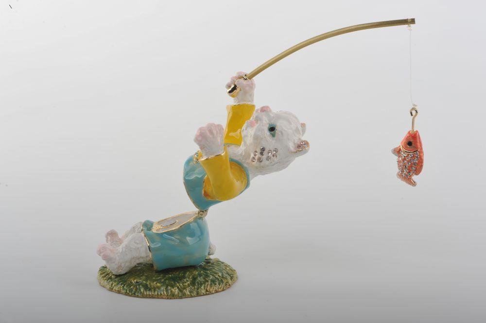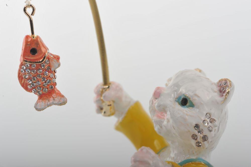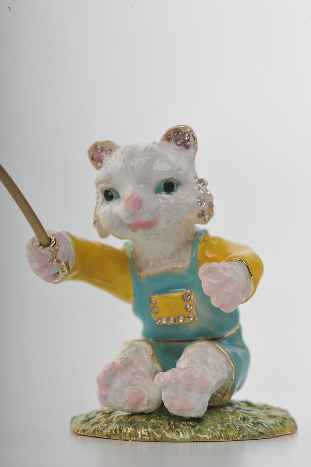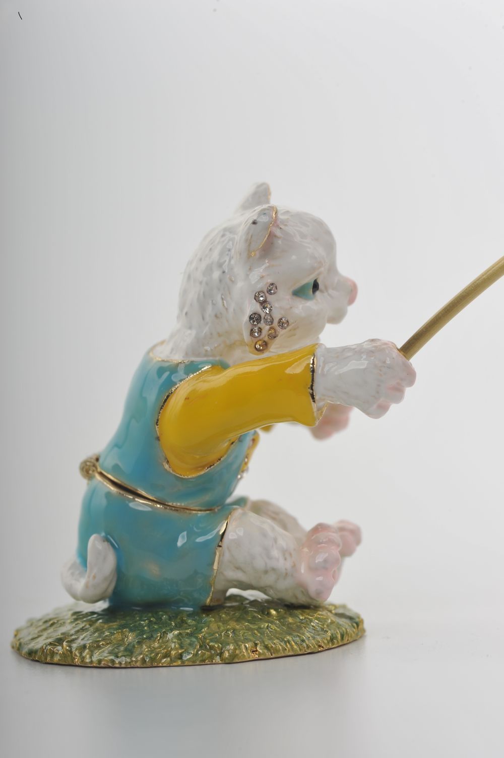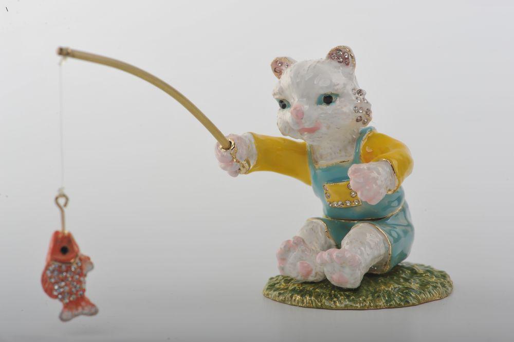 A delightful handmade Cat Fishing Gold Fish Faberge Styled Trinket Box .