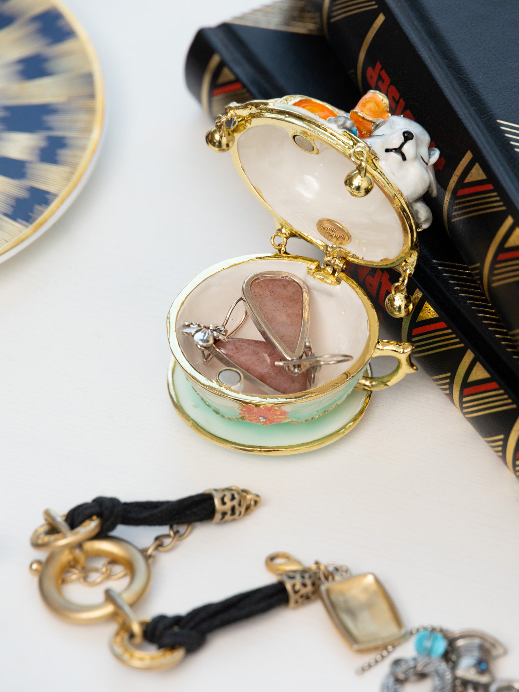 • The trinket box has a magnetic fastener to secure the closure.