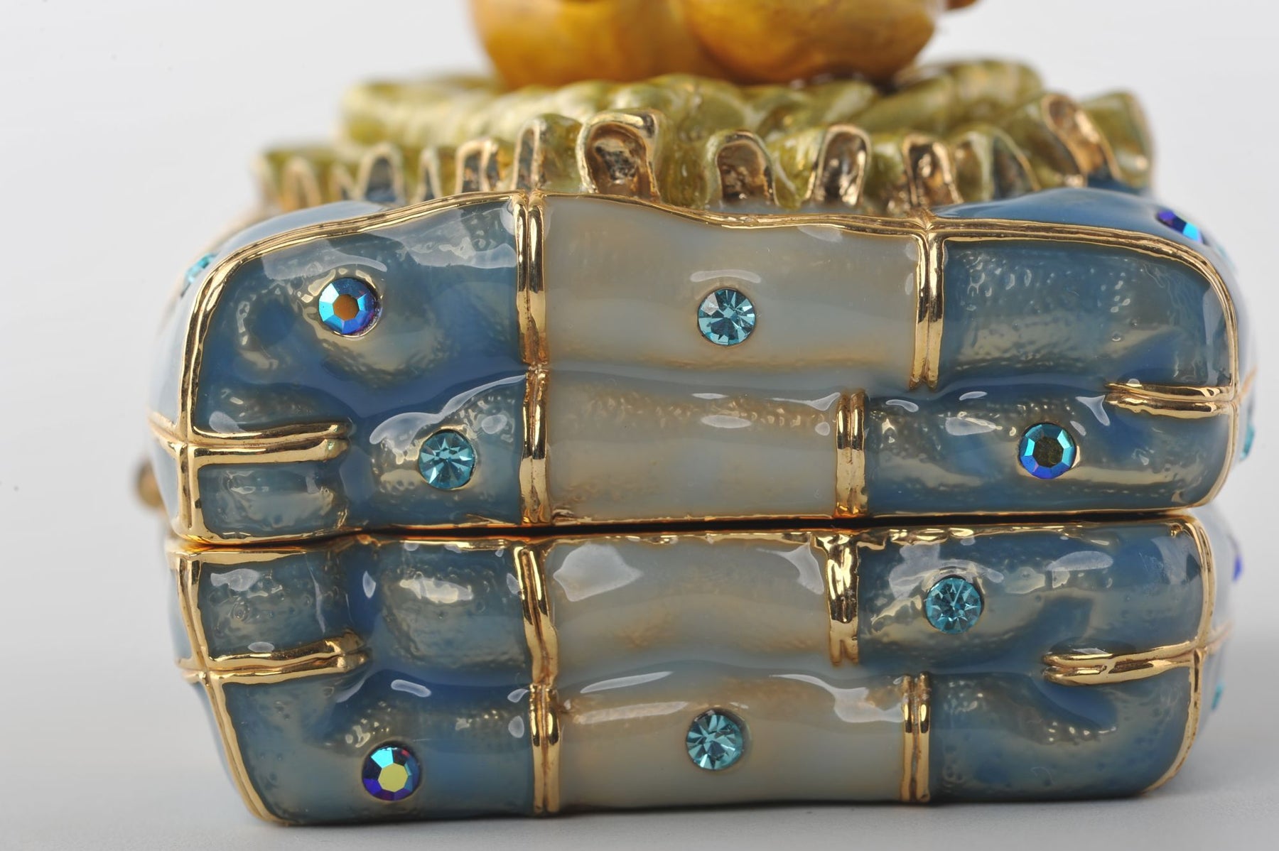 This unique piece is a trinket box in a shape of a suitcase with a teddy bear laying on top.