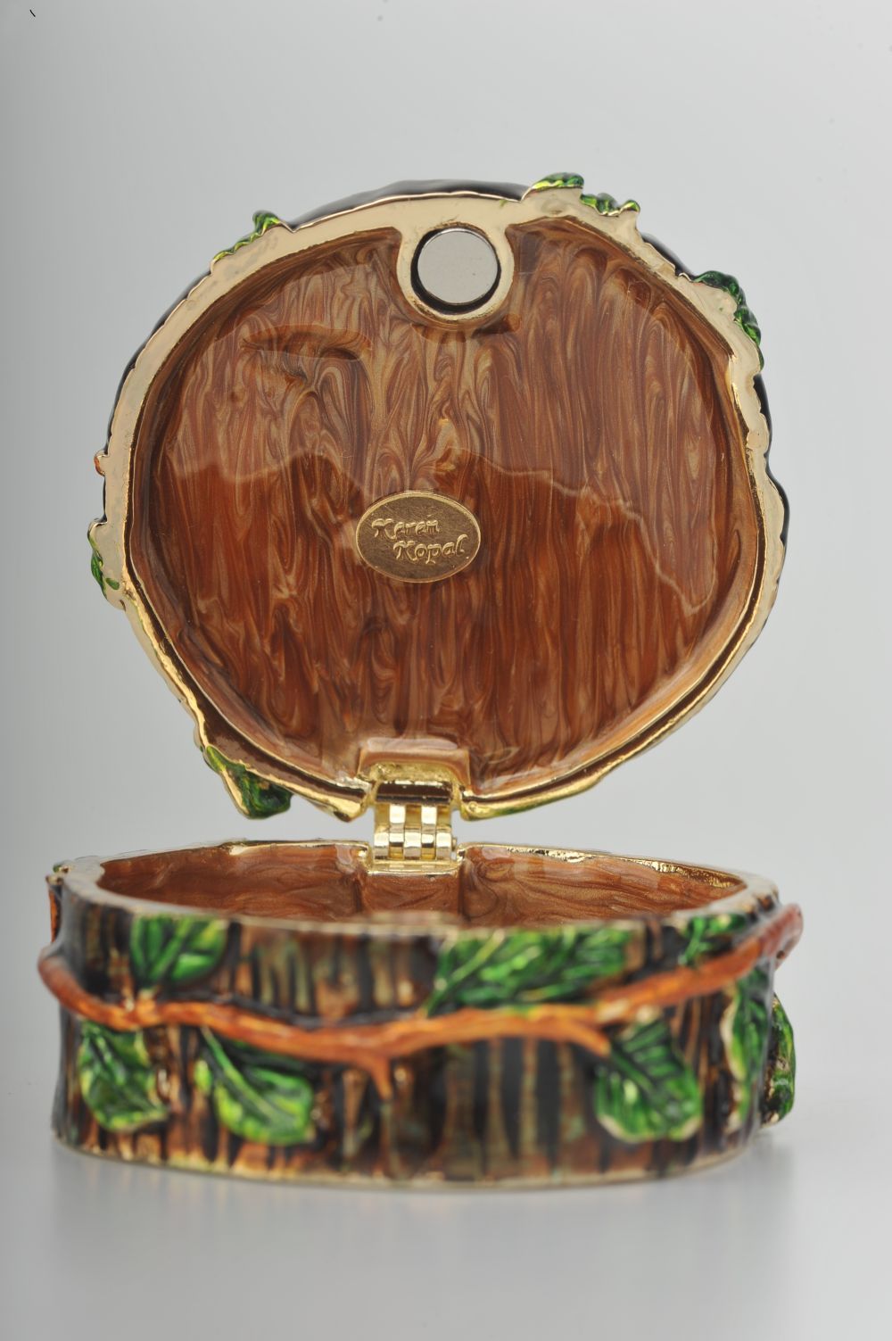 • The trinket box has a magnetic fastener to secure the closure.